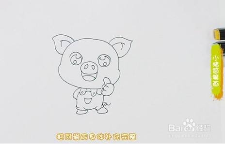 接着画出小猪的身体,小猪穿着背带装,一只手放在身后,一只手竖起大拇指。