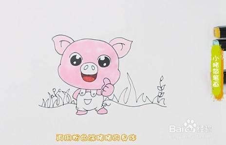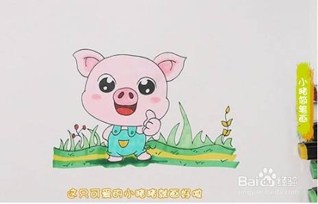 首先画出小猪的头部,头两边画上大大的耳朵,接着画出小猪的身体,小猪穿着背带装,一只手放在身后,一只手竖起大拇指,先给小猪的身体涂上粉色,最后给小猪的背带裤涂上绿色,背景也涂上颜色,可爱的小猪简笔画就完成啦!