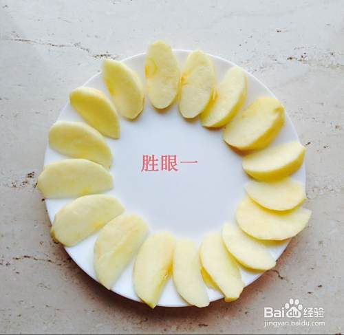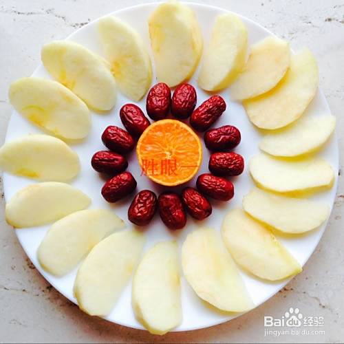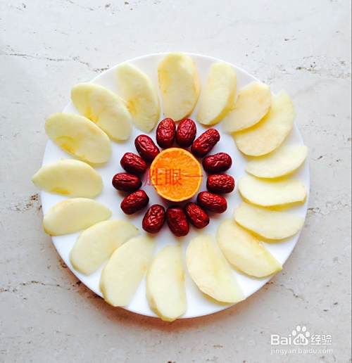 将苹果码放在盘子的周边,中间摆上一圈的大枣。