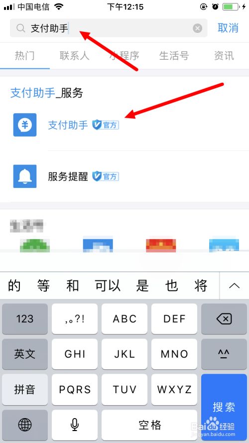 首先在手机上打开并登录支付宝App,并在页面上端的搜索栏里面输入 支付助手 。