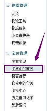 点击“卖家中心”后,再在卖家中心左侧找到并点击“出售中的宝贝”如下图。