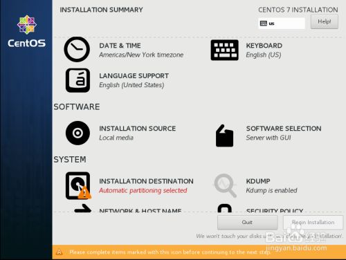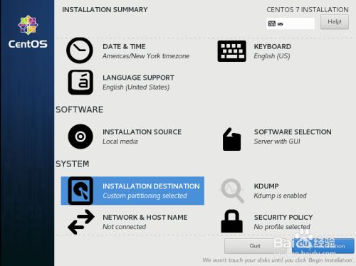然后进入图形配置界面,选择English(默认的界面),点击continue,然后时区选择为中国上海,软件包选择Server with GUI,点击安装位置,进入之后开始手动分区。分区如下图,swap分区一般是内存的2倍大小,其他的分区按照实际情况给于大小,最后一步把之前剩下的空间全部给根目录/。