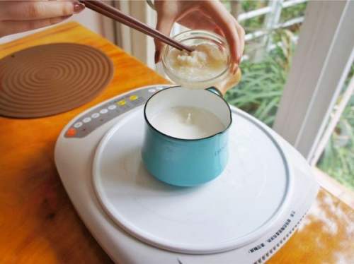 6小奶锅里加入牛奶,快烧开时加入醪糟~加入一丁丁点,就是手指刚刚能捏起来的纯碱,即可。不讲究的纯碱也不用加了。保持微沸即可。