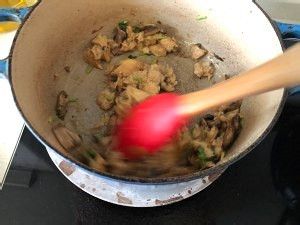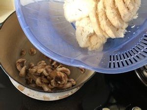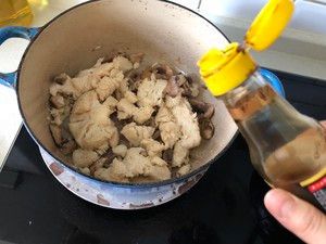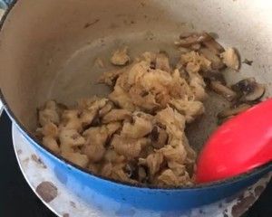 在锅内到适量油,大火加热约5分钟或至5成热,然后倒入蘑菇炒至均匀裹油,倒入猴头菇,翻炒均匀