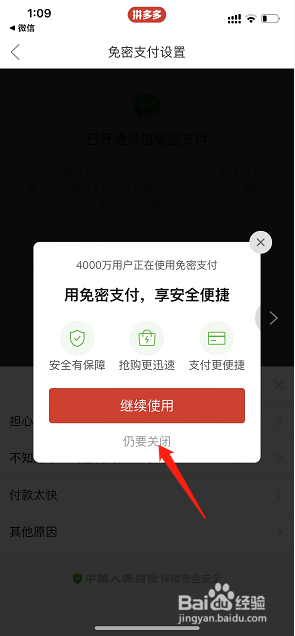 打开拼多多,点击个人中心,点击设置,找到免密支付设置,点击已经开通免密支付的支付选项,点击关闭免密支付,在弹出的选项中选择关闭的原因,点击仍要关闭即可完成。