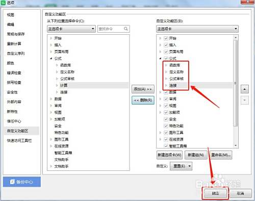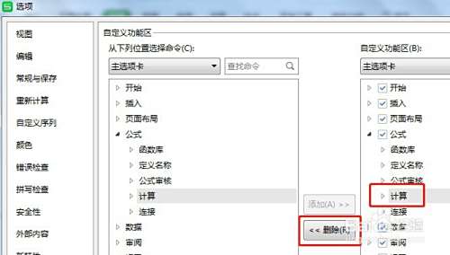 在右边的自定义功能区里面选中【公式】里面的【计算】,然后点击【删除】