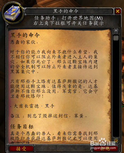 接到任务[黑手的命令]后,我们去打通10人团队副本[黑石塔-上层],并击杀最后BOSS达基萨斯将军。