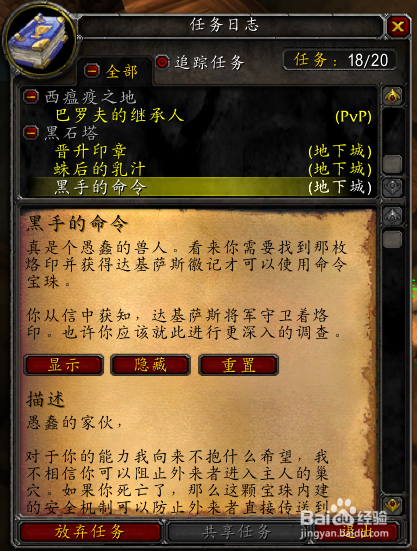 击杀掉NPC裂盾军需官会拾取一个任务道具[黑手的命令],使用该道具后会接到任务[黑手的命令],然后可以进行下一步:打通[黑石塔-上层]。