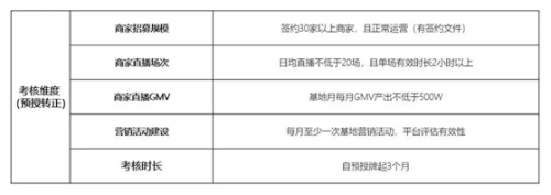 3. 转正标准:若考核数据合格,即可转正授予正式直播基地牌照资质;若考核数据介于 60%-100%之间,则延长考核期 1 个月,若二次考核不达标则取消预授牌资质;若考核数据低于 60%,则取消预授牌直播基地资质;