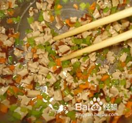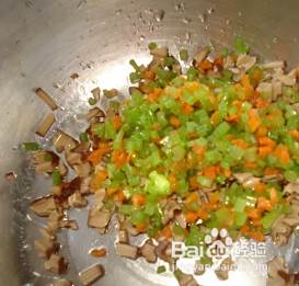 香芹焯水后捞出控干水,放入盆中加入鸡蛋干,胡萝卜