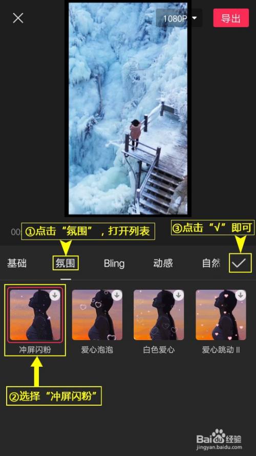 选择特效。点击“氛围”,打开列表,选择“冲屏闪粉”,点击列表右上角的“√”即可。