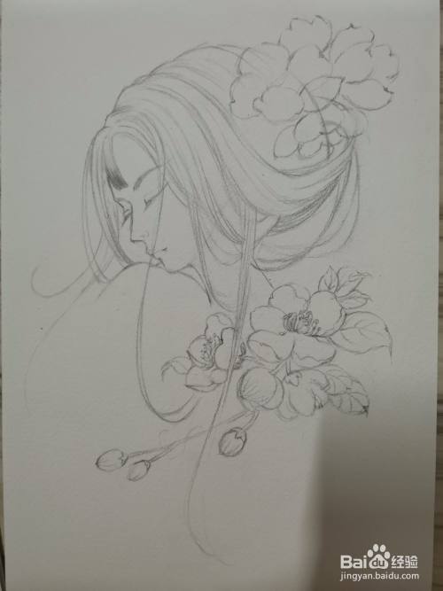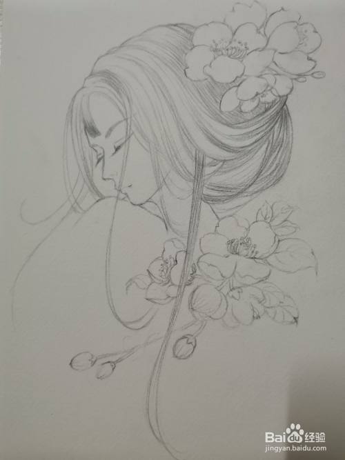 再增加一些头发的细节,进一步增加疏密感,然后再勾勒出头顶花朵外轮廓。
