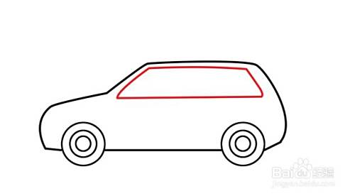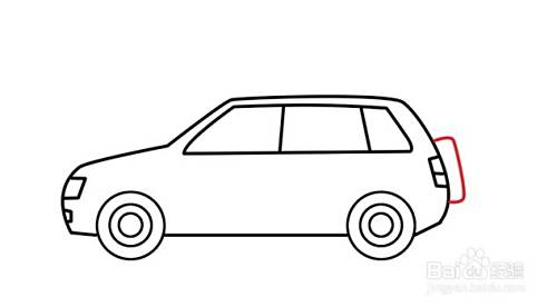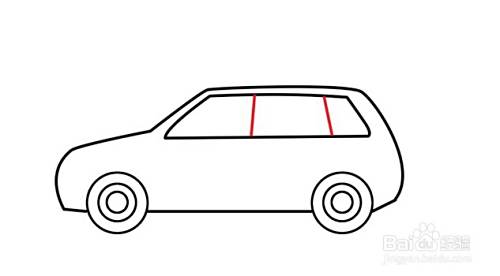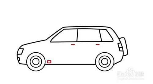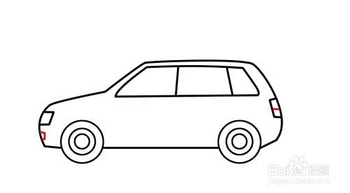 在车子右边叠加画弧线,勾画出轮胎。最后,在车窗下用短横线勾画把手,在左边车轮右边画长方形勾画车子配件。完成了。