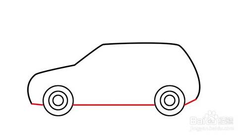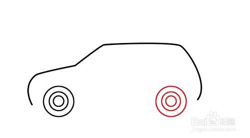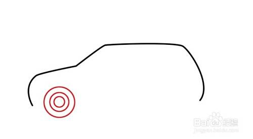 画轮子,在轮廓线左边下方线画一个小圆,再在其外画一个稍大的圆,再在其外画一大圆。用同样的方法在轮廓线右边下方画另外一个轮子。