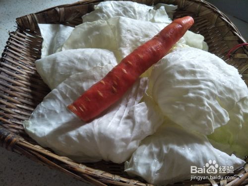 先把莲白一叶一叶切下来,整张叶子清洗干净。胡萝卜也一起洗干净,控干水分备用。