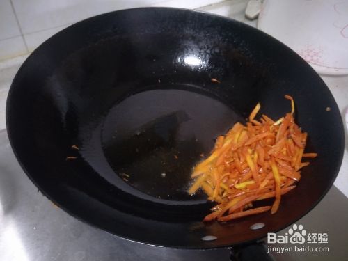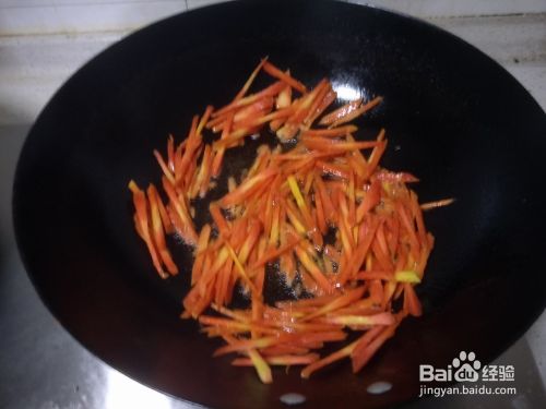 热锅下油,倒入胡萝卜丝快速翻炒。因为胡萝卜和莲白比较更不易熟,等胡萝卜丝七八分熟的时候,把胡萝卜丝装起来。或者拨一边。