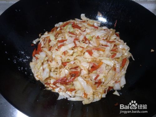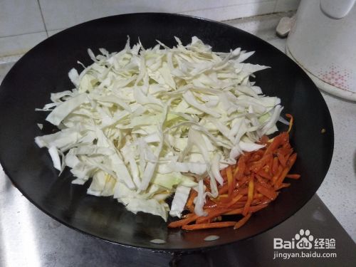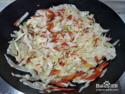 把胡萝卜丝和莲白丝炒熟,因为是宝宝吃,最好是比较软的那种。避免糊锅,可以开中小火炒,或者加少许的开水。