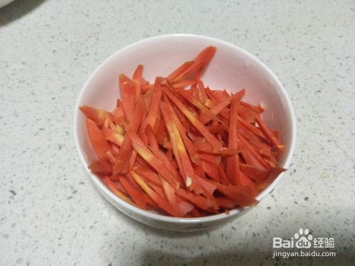 接着把胡萝卜切丝,莲白也切丝,大概一厘米左右的宽度,太细一炒就断了。分开装盘备用。