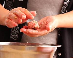 将猪肉滑搓成丸子;