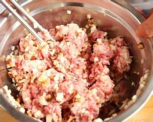 在猪肉滑中加入冬菇粒,马蹄和调料酱讨拌捕冲匀;
