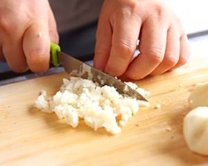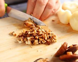 将冬菇先浸泡,然后洗干净沙土,茄捧场挤干水份,切成粒;