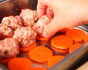 将胡萝卜片放到烤盘中,上面再放上肉丸子;