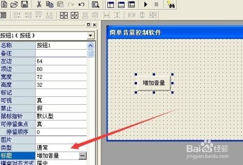 在窗口组件箱中的基本组件中选择按钮,在程序界面上点击,放到合适的位置,修改标题为“增加音量”。