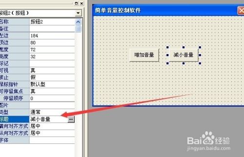 在窗口组件箱中的基本组件中选择按钮,在程序界面上点击,放到合适的位置,修改标题为“减小音量”。