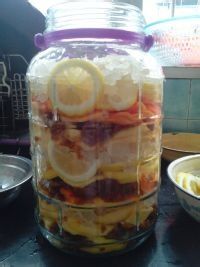 尽量将水果铺平,不要留有空隙哦,到最后放上柠檬和最后一层的糖,用筷子或者勺子将水果压一下,再盖上盖子,密封好....放入阴凉处发酵三到六个月,就可以喝了...
