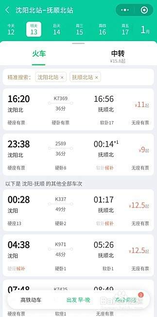 我们把出发地点选择为沈阳北到达地点选择为抚顺北,然后点击查询。