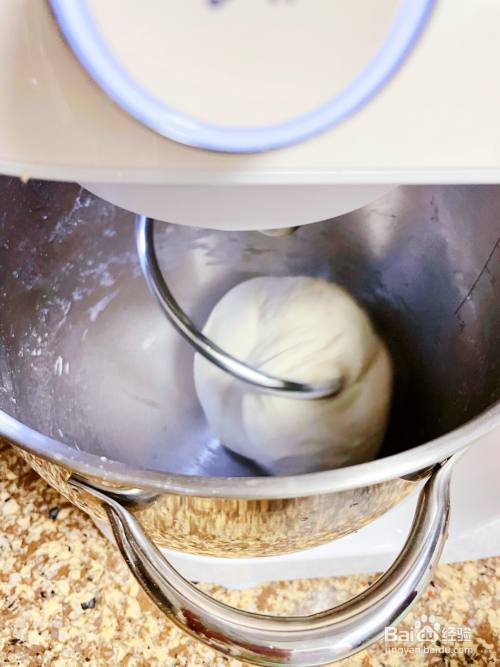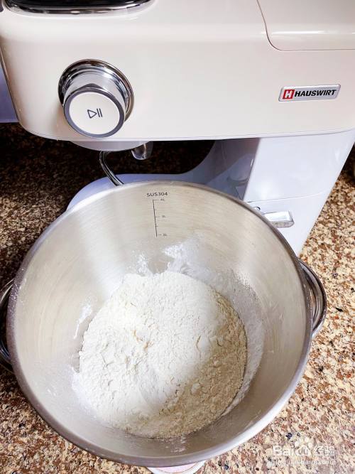 称量好面粉倒入厨师机面桶中。加入4克盐,然后倒刚烧开的开水烫面,用筷子搅成面絮。然后加150克温水,开2档8分钟。