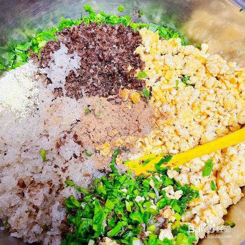 所有材料准备好就开始拌馅儿了,家里炒菜的油,开火烧热了后放凉倒入盆中,大约汤勺一勺。香油适量也可不加调味料的小勺子一勺半盐、大半勺五香粉或者十三香,大半勺味精。然后调匀就可以包啦。 ️