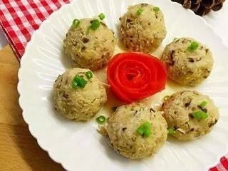 白萝卜、香菇、五花肉、虾皮、料酒和生姜混合,搅拌均匀,加入生抽、白糖、食盐、香油和蛋清,搅拌均匀,加入淀粉,搅拌均匀,分成30g/个,揉圆,放入蒸锅中,蒸熟。