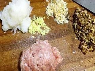 白萝卜挤干,香菇、五花肉、虾皮、生姜和香葱切碎。