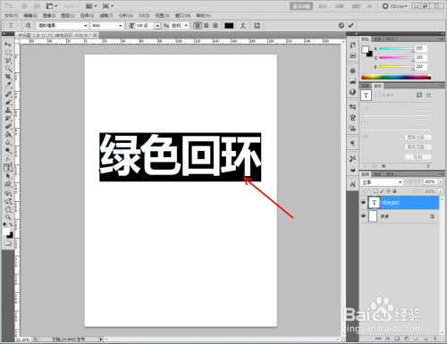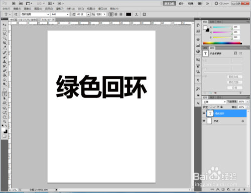 打开Photoshop CS5软件,点击【文字工具】按图示设置好文字各参数后,输入文字内容:绿色回环;