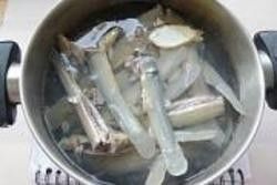 7.移到砂锅里面加水,料酒烧开。