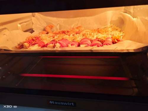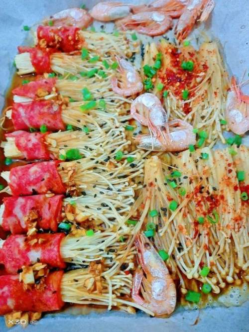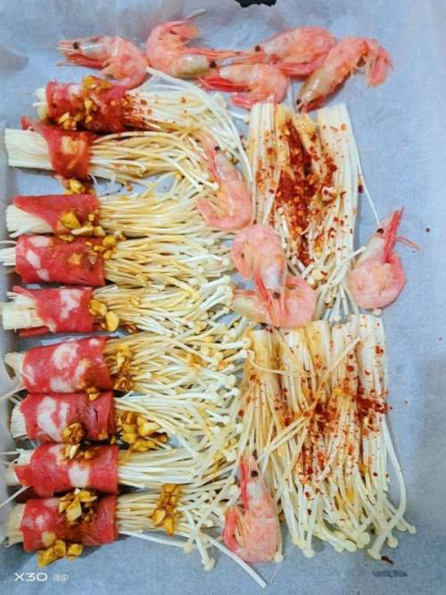 疫情在家,每天就研究吃的了,我们家有三个男生,都爱吃这款培根金针菇。味道真的不比外面的烧烤差。因为小孩要吃,所以一半是不辣,一半辣。顺便烤一些北极甜虾。味道赞。