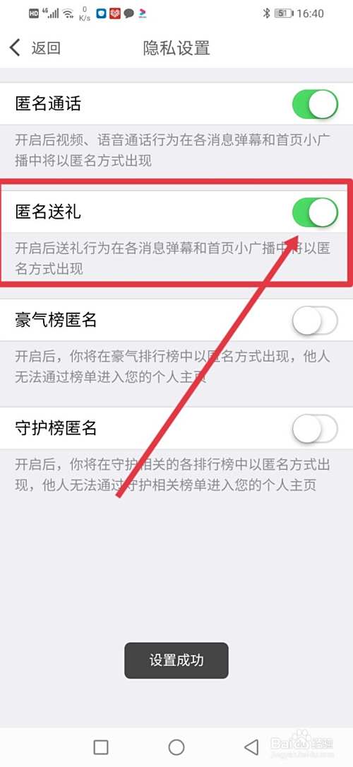 来到隐私设置,接下来把【匿名送礼】的按钮开启即可。