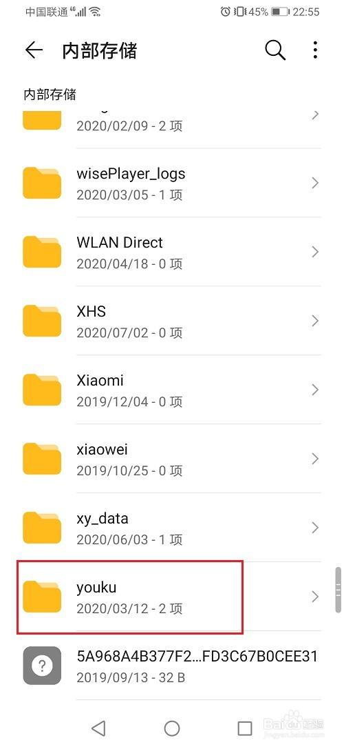 第三步在内部存储中,下滑都底部,点击youku文件夹