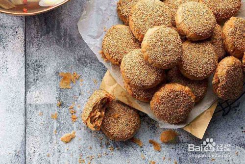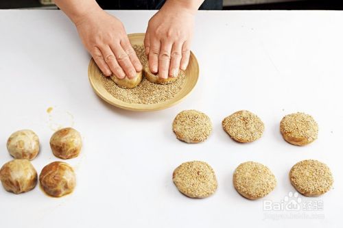 两只烧饼有芝麻的一面互相轻轻拍打几下,使多余的芝麻脱落,也令沾上的芝麻更加紧实。并再次整理成型。