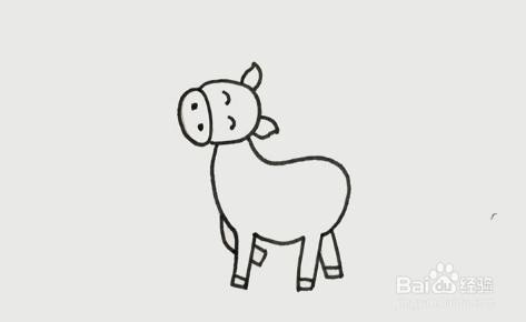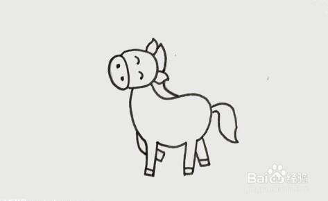 往下画出身体和小马的四条腿,在腿上画出马蹄。画身体的时候画出小马臀部的轮廓。