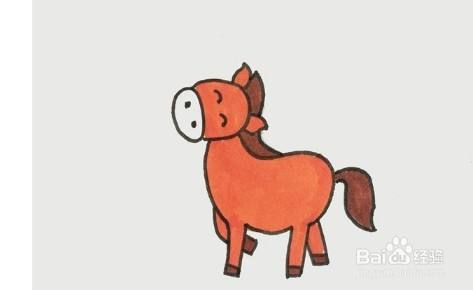 先画出马头,接着画出脖子和身体,头顶画上马的鬃毛,然后在身后画上马尾巴,最后给小马的身体涂上橙色,毛发和蹄子涂上棕色,简单又可爱的小马就画完了。