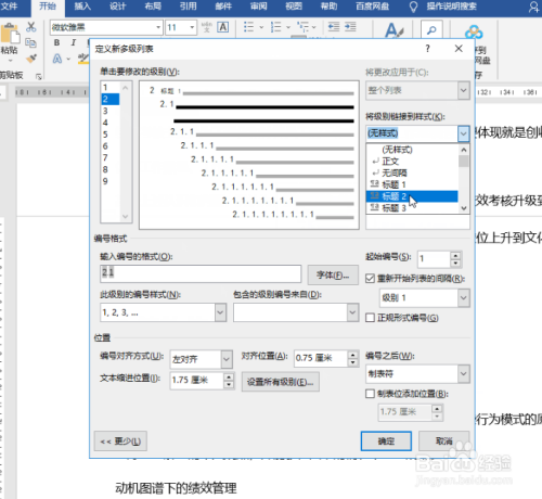 与第二步相同操作:全部选中二级标题后,依次点击【开始】-【段落】-【多级列表】-【定义新的多级列表】级别选为2;接着再点击下方的【更多】,在右侧【将级别链接到样式】设置成【标题2】;在【要在库中显示的级别】设为【级别2】。