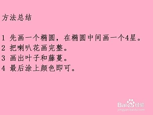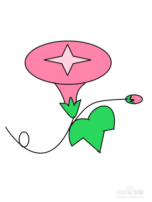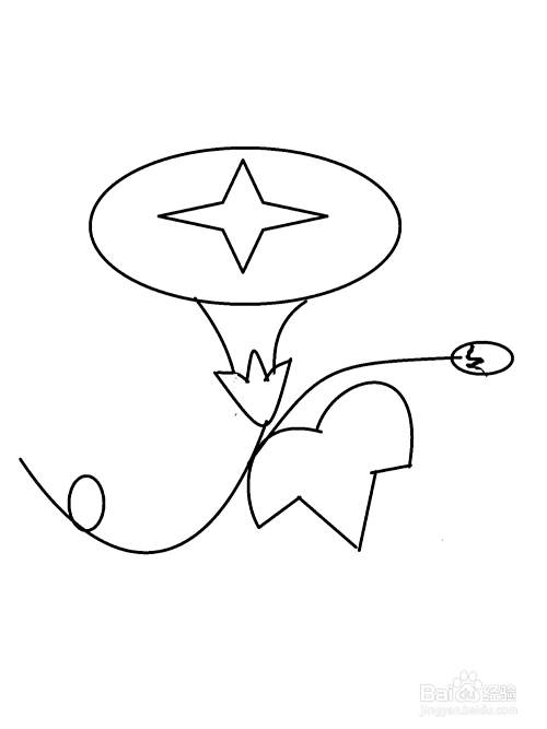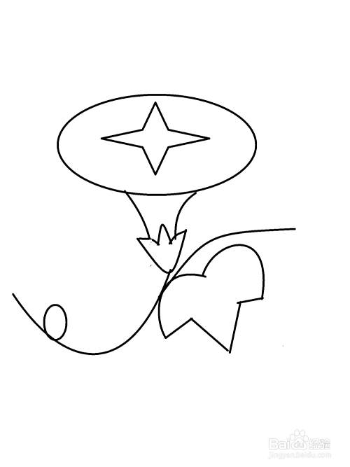 在喇叭花和叶子之间画一条藤蔓,如图所示。