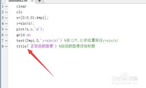 利用title函数可以在matlab中添加文本,调用格式是title(text),在新建脚本文件中输入下图所示程序,这里以给函数y=sin(x)添加文本为例