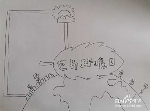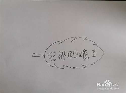 在白纸的底部画上一片大叶子,在叶子中间写上“世界环境日”。
