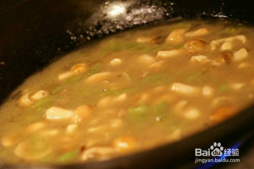 不停地翻炒,不能炒糊避免中毒,期间要放盐,这样可以逼出青头菌的水分,而且水分会慢慢变粘,大约5分钟就可以看到粘粘糊糊的汤汁。