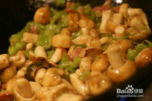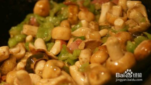 待青椒已经散发出辣味时放入青头菌一起炒。