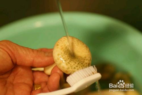 清洗青头菌(因为是野生的,所以泥土较多,用软毛牙刷慢慢冲洗,确保没有泥沙)。
