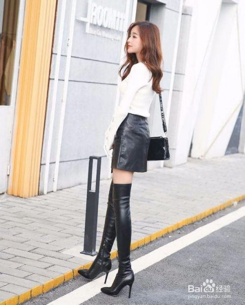 过膝长筒靴搭配皮短裙,短款毛衣。对于爱美的女孩子,冬天也要穿裙子,搭配短裙的话,更具有女性韵味。